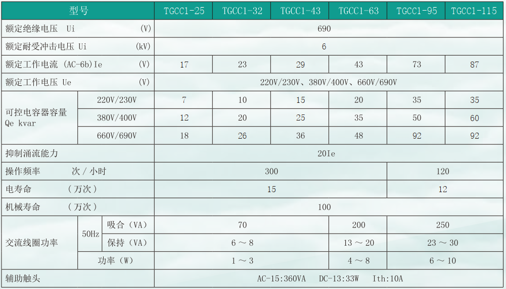 TGCC1 系列切换电容器接触器 ( 以下简称接触器 ), 主要用于研讨 50Hz( 或 60Hz)、额定工作电压至 690V, 在 AC-6b 使用类别下可控制电容器容量至 50kvar 的电力系统中 , 接通和分断并联电容器,以作为改善功率因数之用。